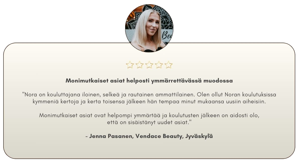 Olen koulutukseltani tradenomi ja SKY-kosmetologi, ja olen viettänyt yli 20 vuotta kauneusalan parissa — hoitolassa, maahantuonnissa, asiakastyössä, kouluttajana ja valmentajana.